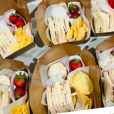 Boxed meals thoughtfully arranged with desserts and beverages, including vegan and gluten-free selections to ensure every guest enjoys a satisfying dining experience.