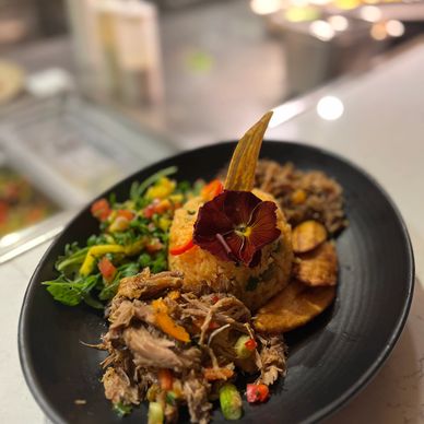 A vibrant plate of Spanish fiesta rice topped with jerk pork, fresh mango salsa, and sweet plantains — a guest favorite during our Crest Theatre takeover events.