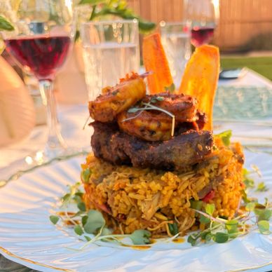 A beautifully plated land-and-sea dish featuring mar y tierra with fiesta rice, thoughtfully garnished with a crisp green plantain chip for a vibrant and flavorful presentation.