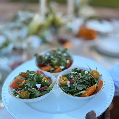 A member of our service team presenting a fresh citrus salad course to guests, part of a beautifully coordinated wedding dining experience designed with care and attention to every detail.